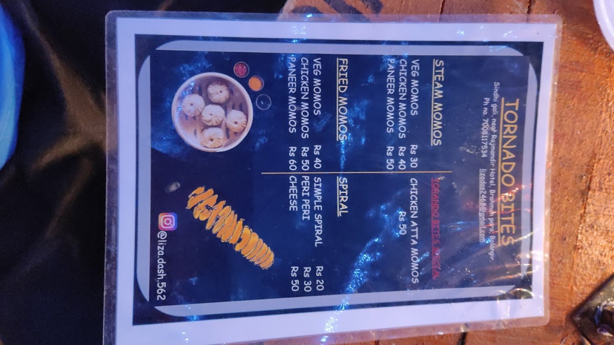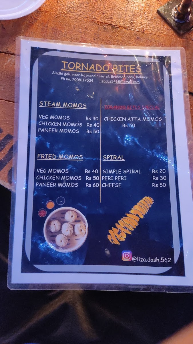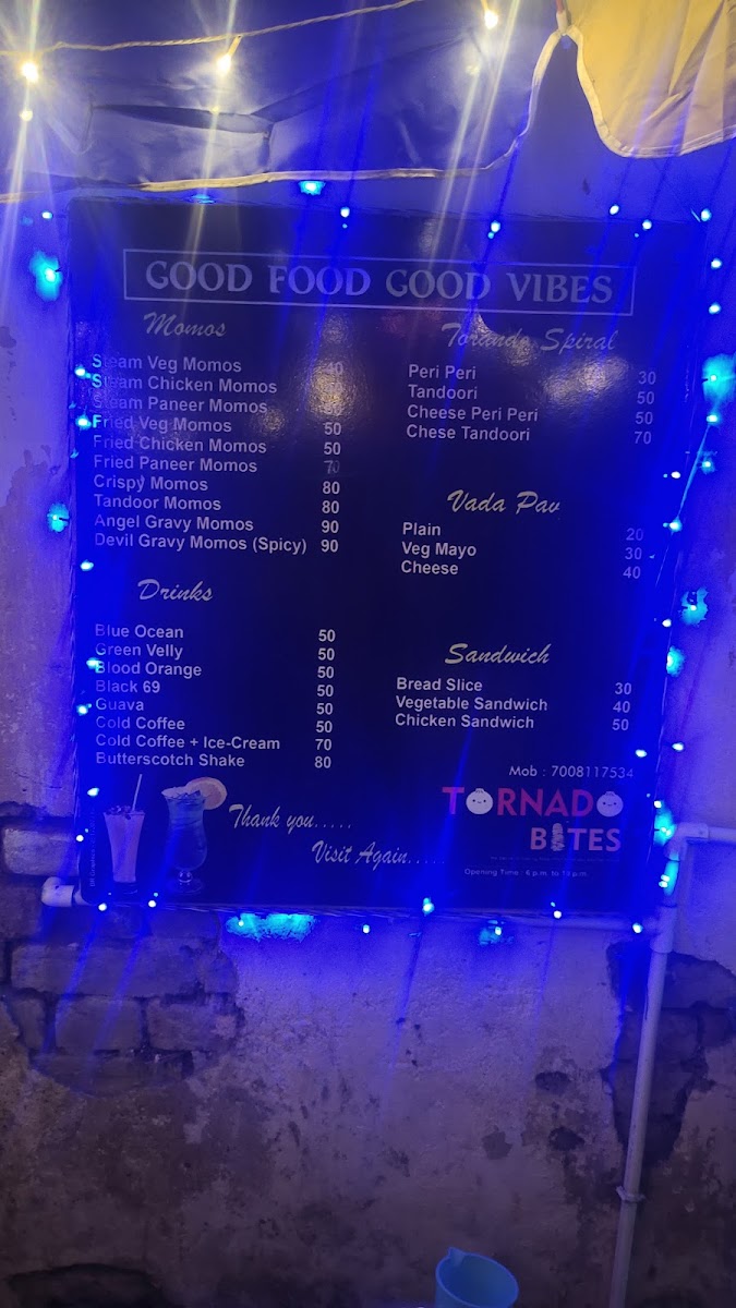 Welcome to Tornado Bites, a delightful café located on P.P Academy Road, Balangir, Odisha. This cozy spot has quickly become a favorite among locals, thanks to its diverse menu and inviting ambiance. Highlighting their selection, you can indulge in a variety of soups, such as Corn Soup and Chicken Hot & Sour, each priced affordably. The star of the menu, however, is their tantalizing range of momos, praised by patrons for both their crispy and steamed variations.